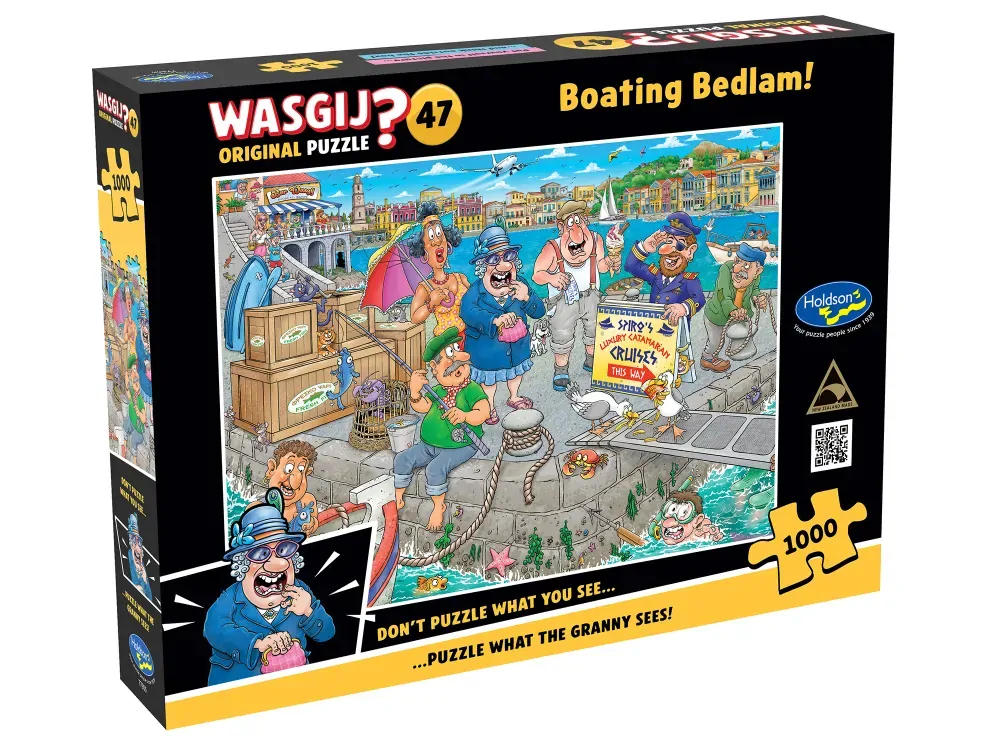 Granny and Grandad Wasgij are enjoying their long-awaited Summer holiday! After months of planning and saving, they have decided to treat themselves to a luxury catamaran cruise. The sun is shining and the bustling harbour is full of surprises, but as they look ahead to their much-anticipated voyage, something has left them utterly gobsmacked! What can they see that has left them questioning their definition of luxury? That is the image you need to puzzle!