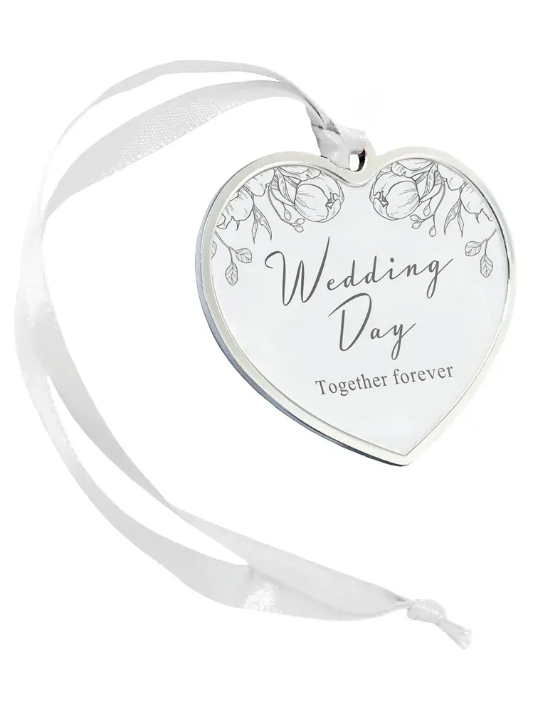 A beautiful silver-coloured ornament to commemorate a wedding day. Held by a white ribbon and in the shape of a heart, it reads 'Wedding Day. Together forever.' Comes boxed.