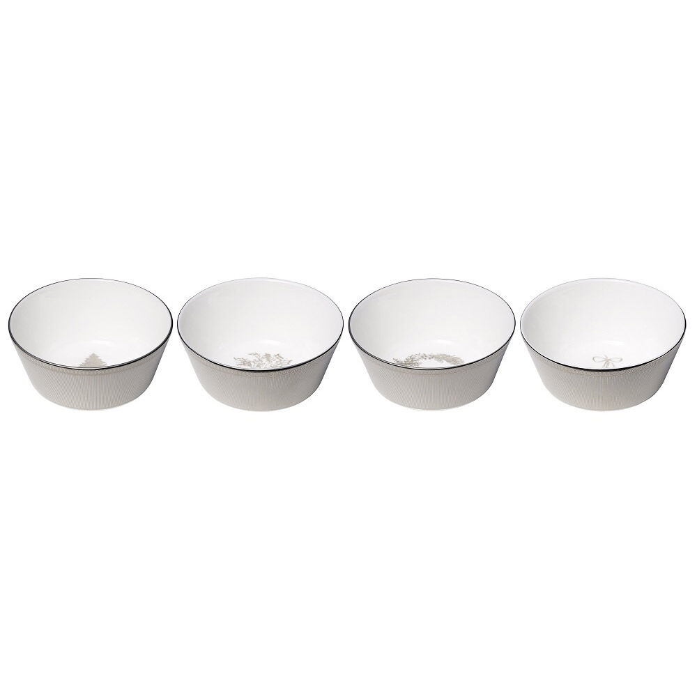 Drinks and delicious nibbles are a customary way to begin the Christmas Day festivities and this set of four 11cm Winter White Nibble Bowls provides a delightful selection of festive themed bowls each carrying a detailed silver illustration of; holly, a wreath, a Christmas tree and mistletoe. The outside of each bowl is embellished with a silver line and scroll pattern for a luxurious, stylish look to enhance the Christmas table. Presented in a signature Wedgwood blue box, this set is crafted in fine bone china for superior strength, silky white colour and translucency making an ideal gift for those who love to entertain at Christmas.