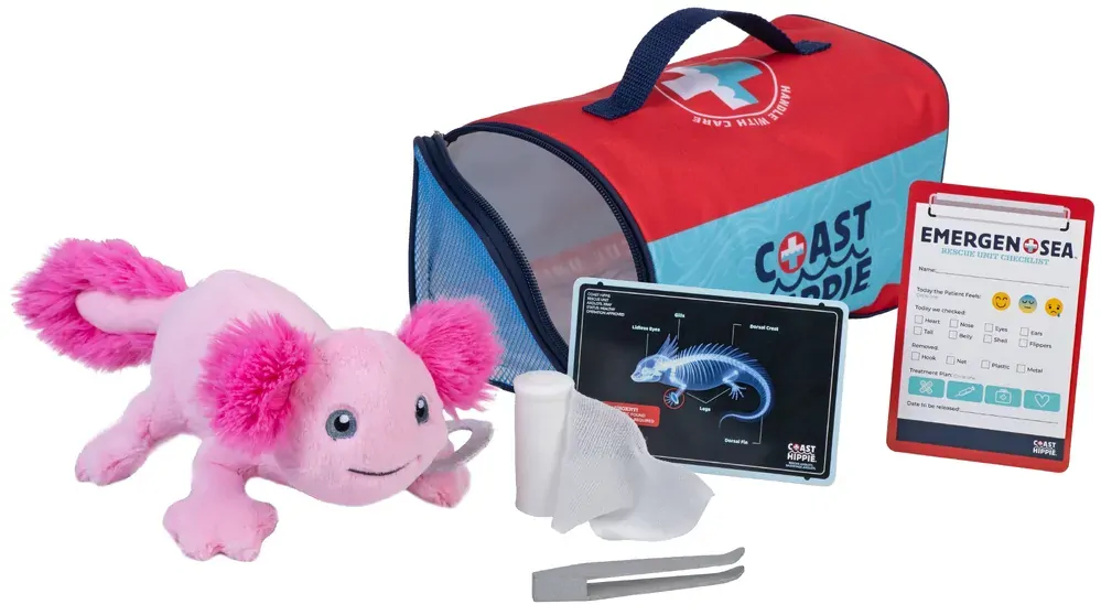 The Coast Hippie Rescue Kit Axolotl by Wild Republic brings a fun and meaningful rescue adventure to playtime. This adorable Axolotl plush needs a caring hero to help it recover. Using the included X-ray and rescue checklist, kids can examine their patient, discover whats wrong, and gently remove obstacles like nets or hooks with the rescue tools. This engaging stuffed animal play set encourages compassion, creativity, and curiosity about aquatic wildlife. Each rescue mission inspires children to nurture and protect animals while enjoying imaginative storytelling and hands-on learning about the wonders of nature.