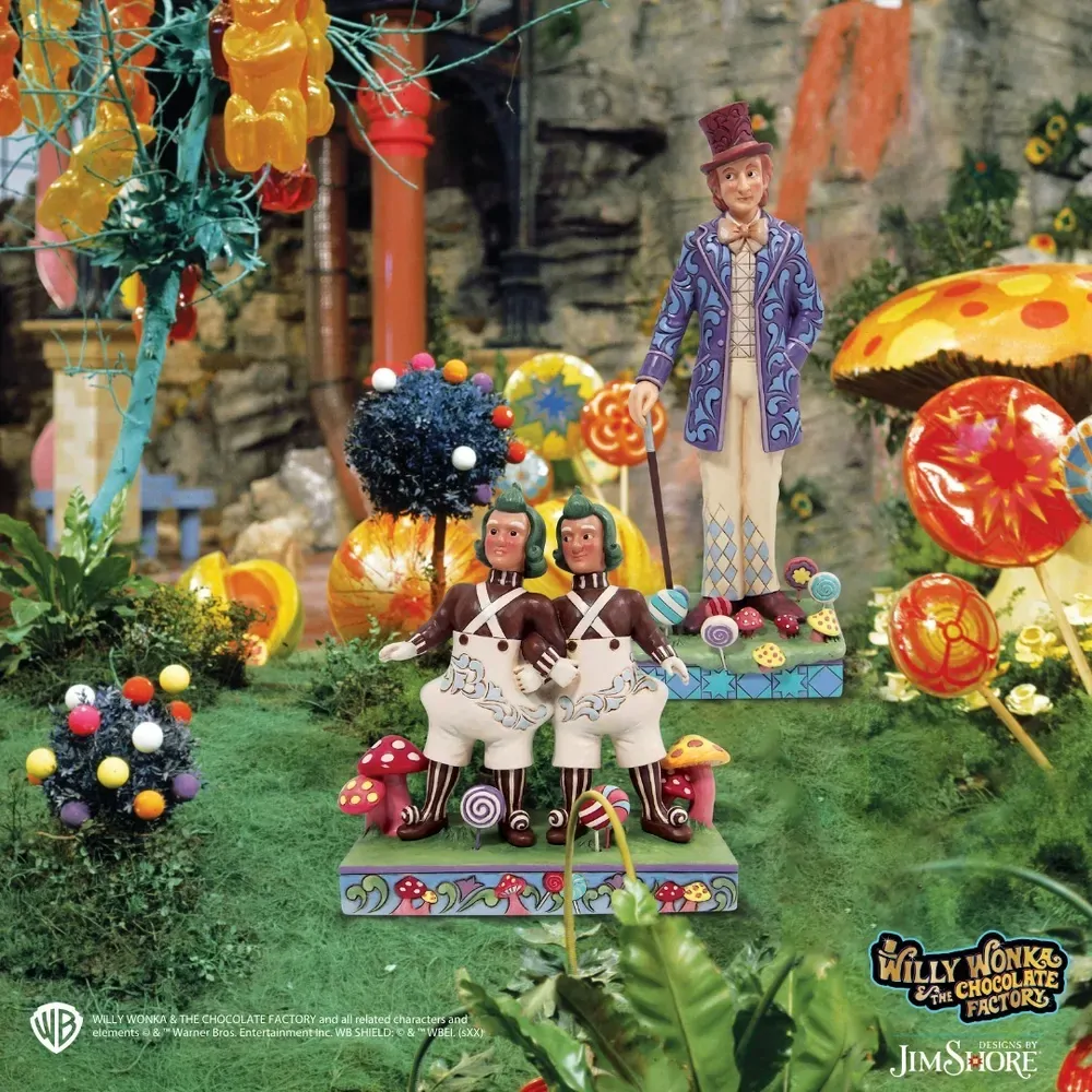 Willy Wonka, the eccentric founder and proprietor of the Wonka Chocolate Factory, poses with personality in this iconic Jim Shore effigy. His emblematic purple and tan suit is fashioned with rosemaling as he stands on a field of candy with a smile.