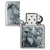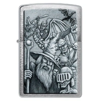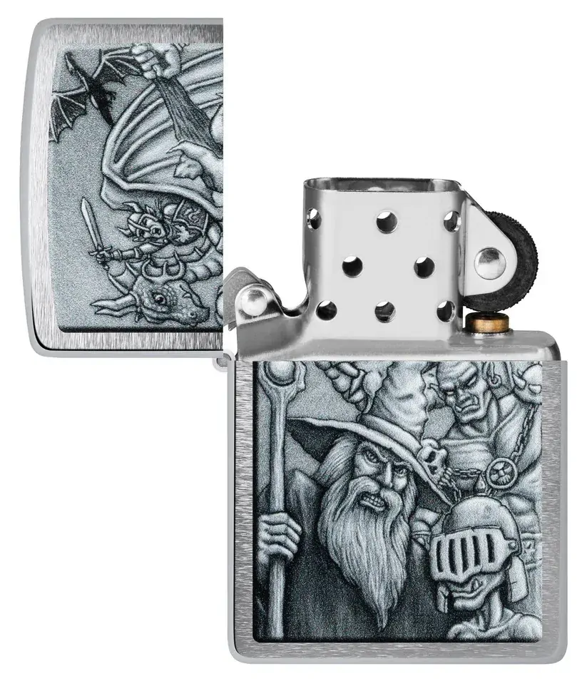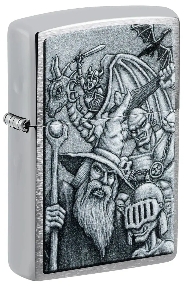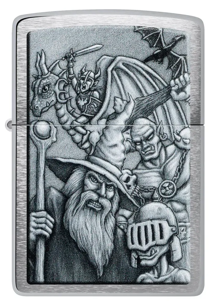 Dive into another world with this classic Brushed Chrome lighter. The Colour Image design mimics a mythological scene complete with goblins, wizards, dragons and more.